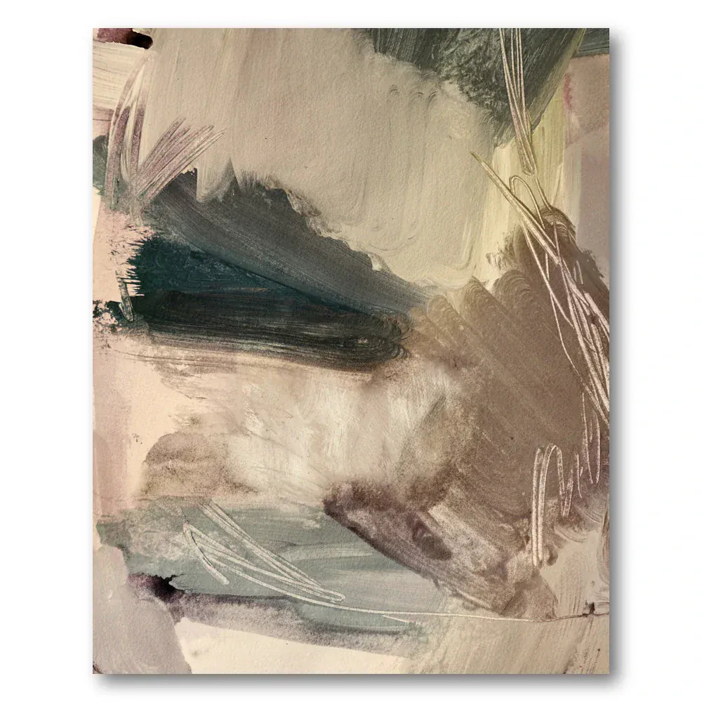 This stunning art print, titled 'Muted Elegance Brushstroke,' features a dynamic interplay of broad, sweeping strokes and subtle textures. The soothing palette of soft taupe, deep forest green, and muted mauve blends harmoniously, creating an atmosphere of tranquil sophistication. An interesting aspect of this piece is its ability to evoke the fluidity and movement reminiscent of abstract landscapes, making it a captivating addition to any art collection.