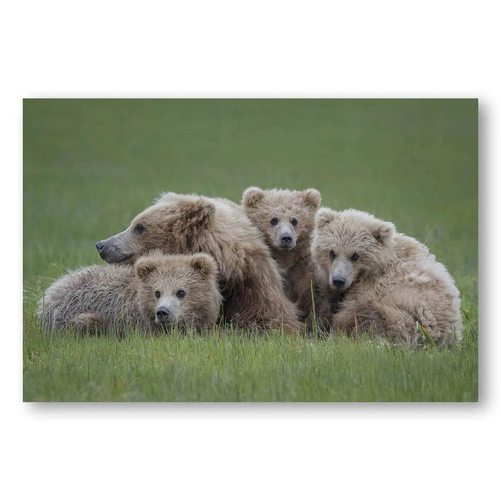 This bear photo print captures a tranquil scene of a bear family nestled in a lush, green meadow. The soft, earthy tones of the bears’ fur contrast beautifully with the rich, verdant grass, creating a harmonious and soothing color palette. The image exudes a sense of warmth and tenderness, making it a captivating addition to any nature lover's art collection.