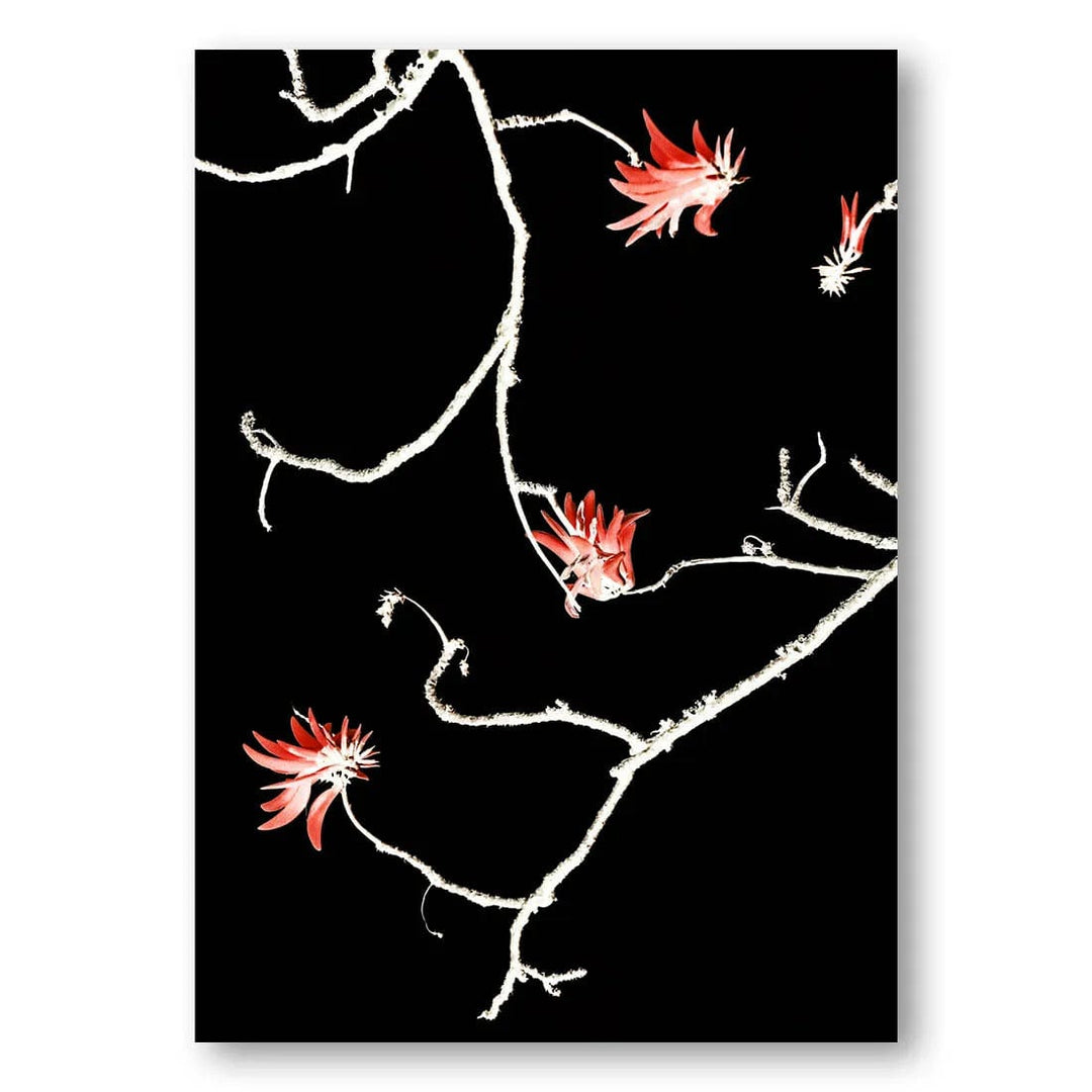 This flower photo print captivates with its striking contrast of vibrant red blossoms against a deep black background, creating a mesmerizing visual impact. The delicate branches intertwined with blossoms evoke a serene and tranquil ambiance, allowing the viewer to experience a sense of calm and elegance. The minimalist aesthetic of the print emphasizes the beauty of simplicity, turning the piece into a captivating focal point for any space.