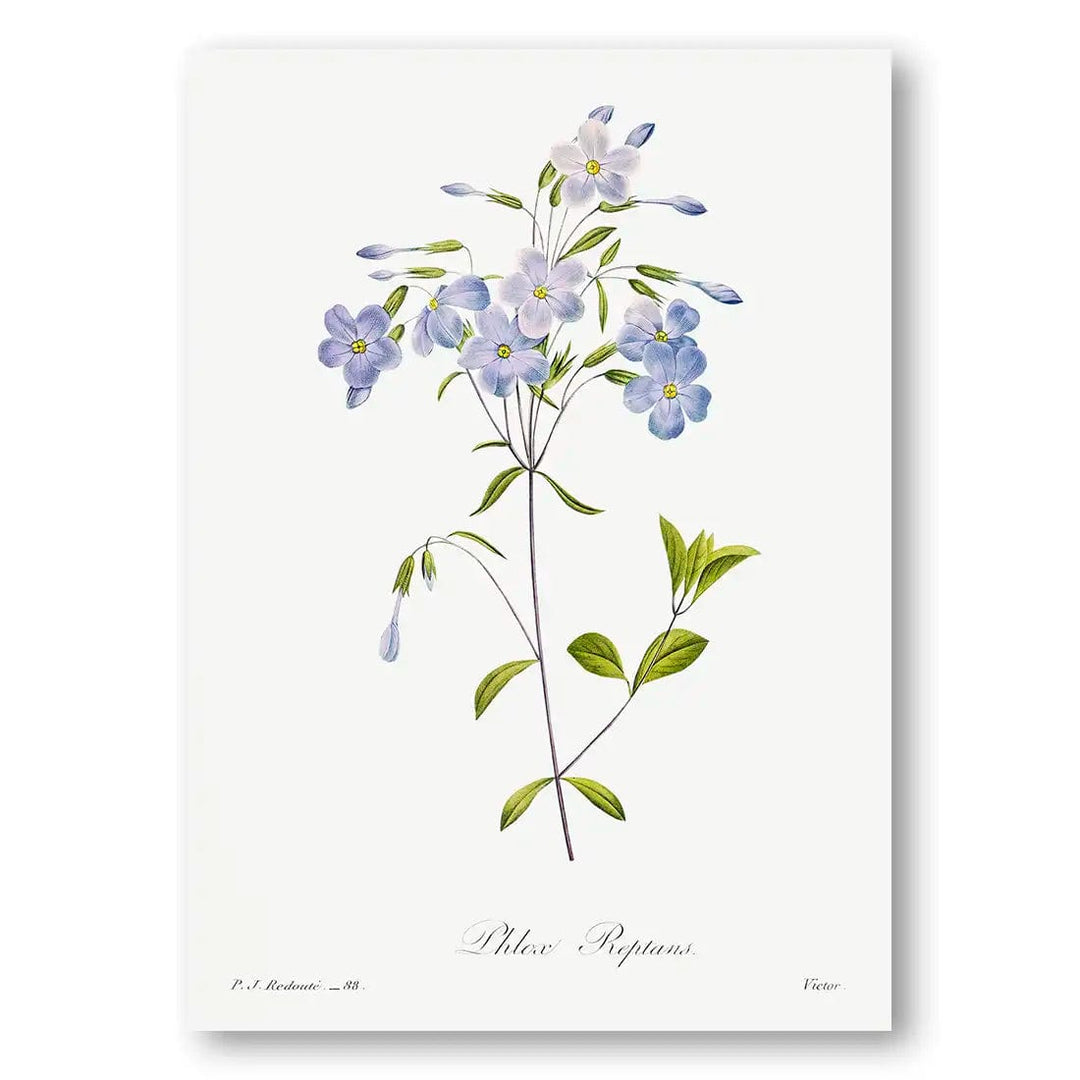 This is a sophisticated and delicate botanical art print featuring an ethereal illustration of the Mertensia virginica, commonly known as Virginia bluebells or "Blue Reptans." The artwork captures the plant's soft blue flowers and green foliage with a lifelike quality, set against a clean white background that enhances its subtle elegance and natural beauty.