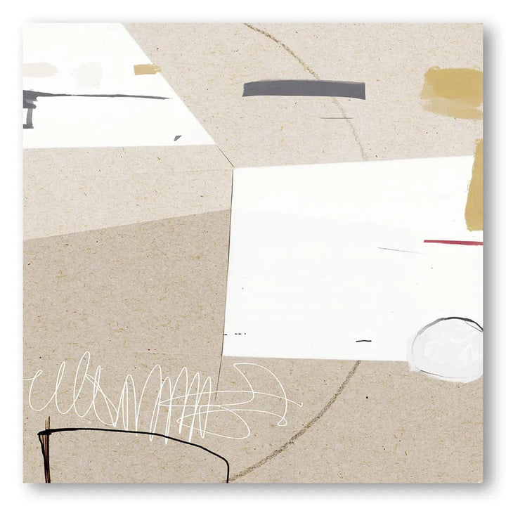 This abstract art print by Dan Hobday features a soothing palette of muted neutrals, with touches of beige, white, and soft black that seamlessly blend together. The ambiance is tranquil yet thought-provoking, inviting viewers to get lost in its minimalist, geometric forms. The aesthetics of the piece are clean and modern, with subtle textures that enhance its depth and visual interest.