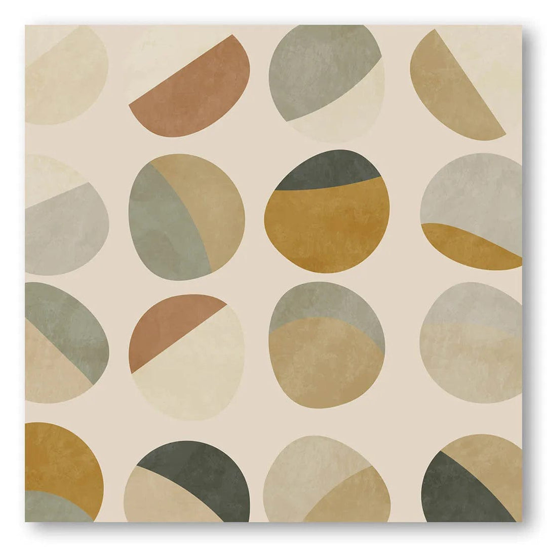 This pattern art print features a harmonious blend of earthy tones including soft beiges, muted greens, and warm browns, creating a soothing palette. The subtle interplay of colors and shapes evokes a calm and serene ambiance, perfect for elevating any living space. Its minimalist aesthetics and organic shapes provide a contemporary yet timeless appeal.