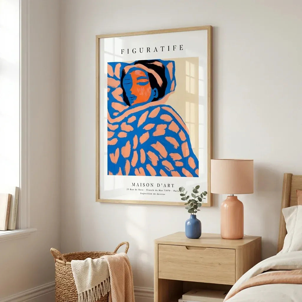 The art print "Poster Portrait Series 02" showcases a serene face wrapped in a striking pattern of vivid blue and soft peach hues. The composition creates a calming yet dynamic ambiance, blending bold colors with gentle expressions. Its aesthetic bridges modern abstraction with warmth, inviting viewers to a tranquil introspection.