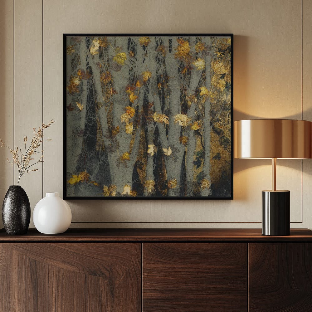 Luxurious abstract in stormy slate with shimmering gold leaf accents scattered like autumn treasures. This opulent piece radiates glamorous warmth and artistic sophistication, stunning above mantels, in entryways, or as a bedroom focal point. The metallic highlights catch light beautifully, infusing spaces with elevated energy and modern elegance.